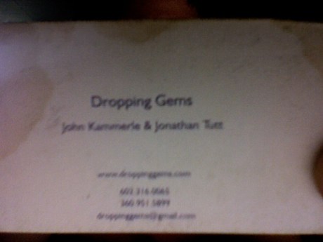 C Well I was in class at Evergreen with founding member John Kammerle aka Rapclass in 2008. It was like a music technology summer class and we were both making these little hip hop jams which I think we bonded over. One day after class we were walking together and he handed me this business card that just said Dropping Gems on it with he and Gumar’s names and contact info. That was it… no other explanation. I was like “ok my dude, thanks” and for some reason I held on to the card because I thought it was funny. I actually still have it, it’s hella stained and gross now but here’s a picture anyway.
